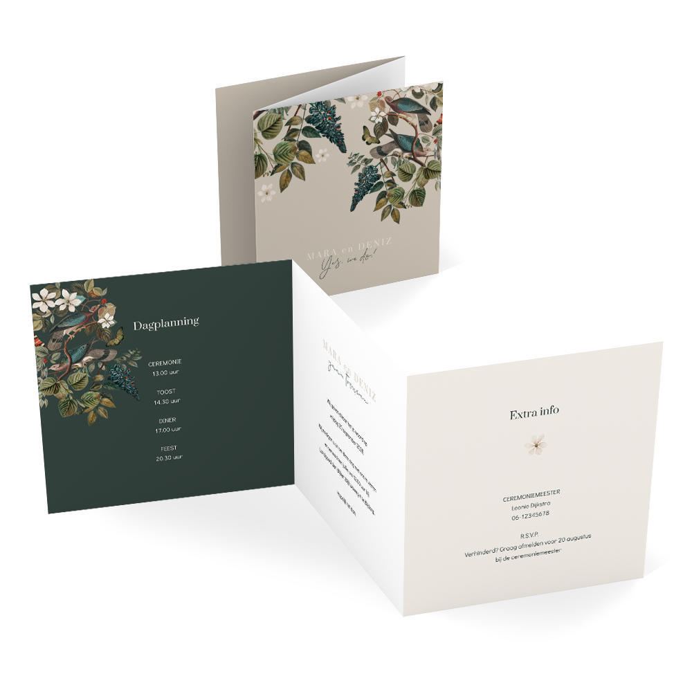 Op zoek naar een unieke trouwkaart voor jullie bijzondere dag? Ontdek dan deze prachtige drieluik trouwkaart met zigzag-vouw met botanical vogels! Deze trouwkaart is voorzien van een stijlvol ontwerp en maakt zeker indruk op jullie gasten. De botanische bladeren en bloemen met beige achtergrond geven de kaart een stijlvolle uitstraling. Subtiel is er een vlinder te vinden tussen de botanische vogels.