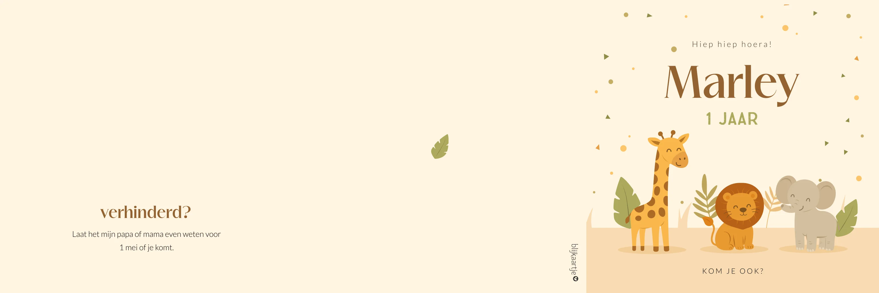 Vrolijk zigzag uitnodiging voor de eerste verjaardag van een jongen of meisje. Op deze verjaardagsuitnodiging staan verschillende safari dieren, een giraffe, olifant en leeuw. De confetti maakt de uitnodiging voor een kinderfeestje extra feestelijk. Pas dit drieluik verjaardagskaartje eenvoudig aan in de editor.